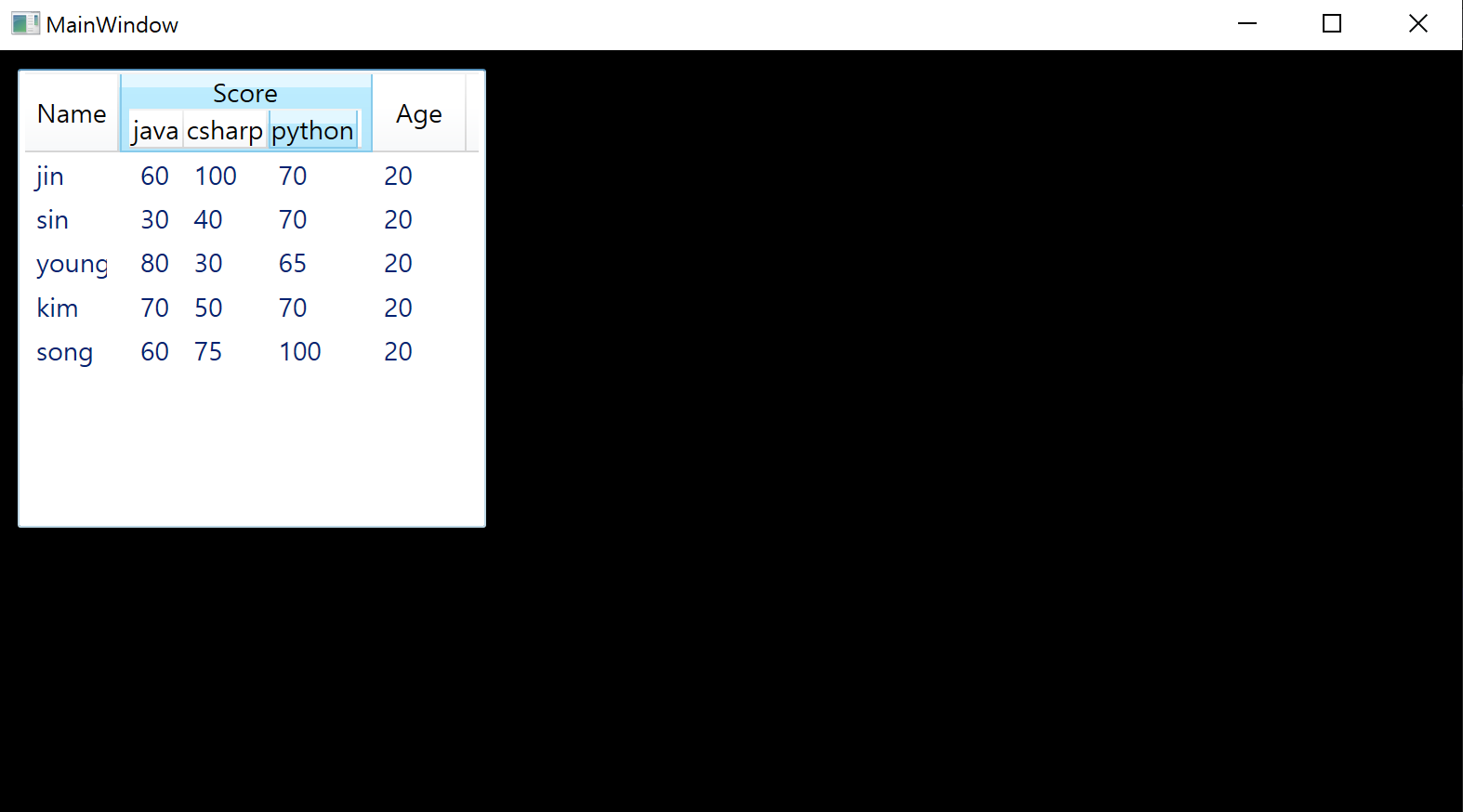 students.Add(new Student() { name = "jin", csharp = 100, java = 60, python = 70, Age = 20 });