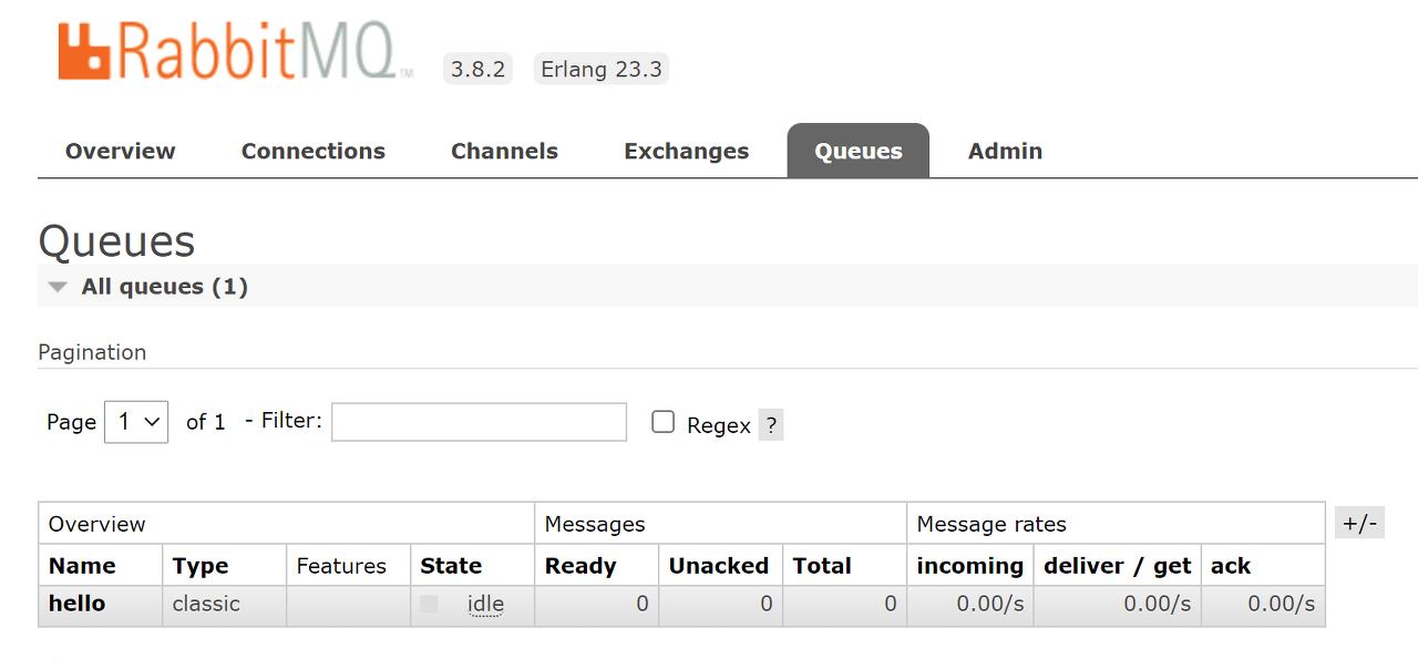 Rabbitmq 클라이언트 화면에서 큐가 생긴것을 확인한다. “hello” 라는 이름의 큐 생성